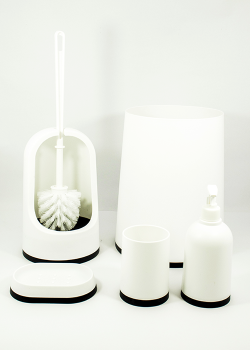 A 5-Piece Bathroom Set Made Of Plastic. The Color Is White With Black Accents.