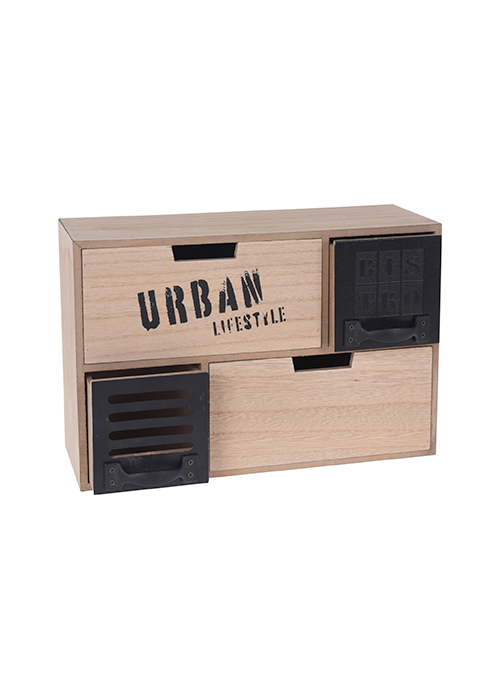 Wooden dresser with 4 drawers decorative desk storage box. 1 With metal front and handle ,1 with black front and embossed bistro design and two with black print