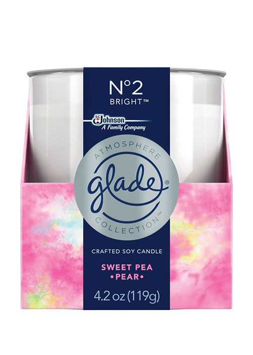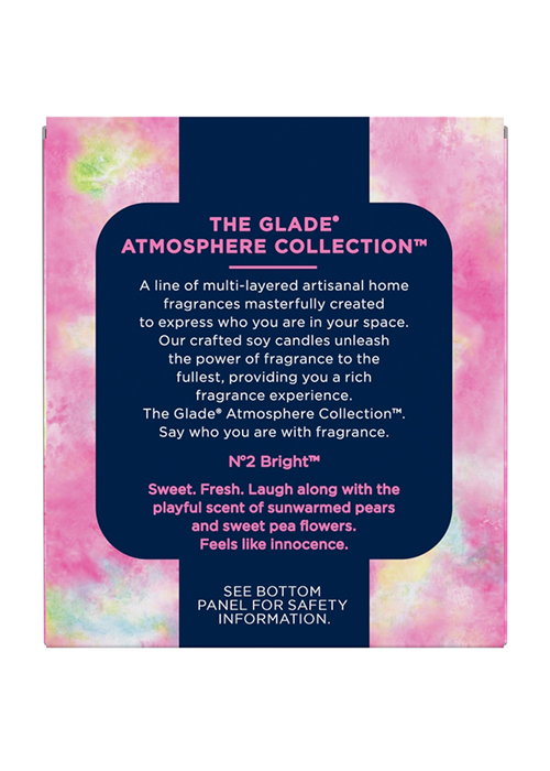 A line of multi-layered artisanal home fragrances masterfully created to express who you are in your space. Our crafted soy candles unleash the power of fragrance to the fullest, providing you a rich fragrance experience. The Glade Atmosphere Collection. Say who you are with fragrance. * •Crafted soy candles provide rich and long lasting fragrance experience * •Fragrance lingers after the candle is blown out * •Sweet, fresh, laugh along with the playful scent of sun-warmed pears and sweet pea flowers, feels like innocence