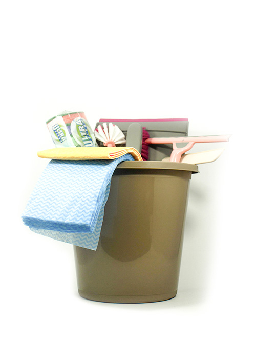 Cleaning Set Containing Lots Of Cleaning Products In One Bucket. From Hand Sweeper, Wipes To Sponge And Window Wiper