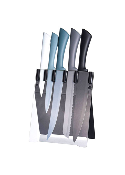 The elegant and practical set of knives is versatile in the kitchen. The knives are equipped with an ergonomic Soft Touch colored handle, a sharp stainless steel blade and a smooth surface. They are highly durable and easy to maintain. Stored in a design black stand. The set consists of 5 different knives.