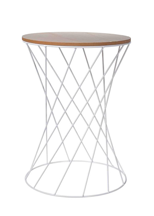 This unusual side table in a modern design, consisting of a round natural-colored wooden table top and a white metal frame, is versatile and therefore ideally suited for use as a couch, bedside, telephone, flower, serving or side table. Due to the diagonally inward running metal frame, the table cuts a great figure and offers a Ø35cm storage space for snacks, drinks, decoration etc.