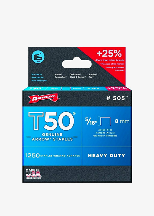 The Arrow ARRT50516S T50 Staples Box contains top quality 0.050 wire staples for use with T50 and T55 tackers: