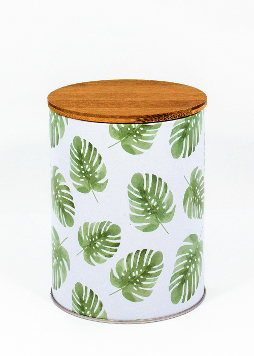 Storage Tin With Exotic Leaves Pattern with Bamboo Lid 15.5cm X 11.5Cm